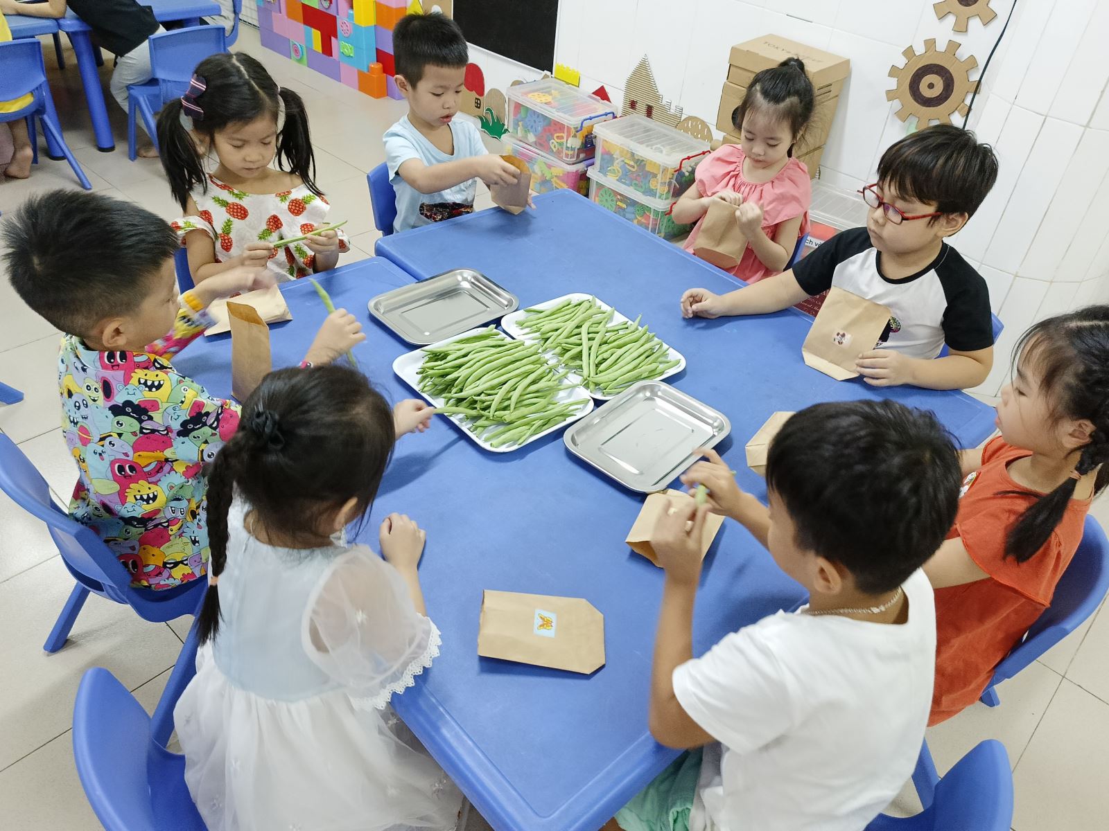Với trải nghiệm nhặt đỗ cove giúp các bé rèn kỹ năng vận động tinh, rèn khả năng quan sát. Bé hiểu được giá trị dinh dưỡng có trong rau xanh và các loại củ quả, thói quen ăn rau trong bữa cơm hàng ngày. Đặc biệt, phát triển ở trẻ tình yêu với gia đình khi bé được trải nghiệm công việc hàng ngày của bà, của mẹ. Từ đó thấu hiểu nỗi vất vả của người thân khi chế biến một bữa cơm gia đình.