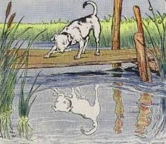 Sói quay đầu nhìn lại thì quả nhiên "có cái gì đó" đen, dài, ở trên mặt đất. Nó xông lại ngoạm, cắn, chiếc bóng bèn chạy về phía trước mặt nó. Nó chồm lên, cái bóng cũng chồm lên. Sói cứ đuổi cái bóng của chính nó cho tới khi rơi tõm xuống vực núi mà chết.