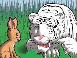 Chú Thỏ chạy một mạch đến hang Cọp. Nó chạy nhanh đến nổi suýt chút nữa là đâm đầu vào các móng vuốt của Cọp . Nhưng cũng may là nó dừng lại kịp và cẩn thận giữ một khoảng cách khá xa để không bị con thú độc ác kia chụp trúng được.