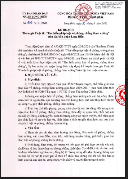 Thực hiện kế hoạch số 333/KH-UBND ngày 15/9/2021 của Ủy ban nhân dân Quận Long Biên về việc ban hành kế hoạch “Tham gia cuộc thi về tìm hiểu pháp luật về phòng chống tham nhũng trên địa bàn Quận Long Biên” Trường mầm non Sơn Ca đã triển khai hưởng ứng Cuộc thi “Tìm hiểu pháp luật về phòng, chống tham nhũng” tới toàn thể CB GVNV trong nhà trường.