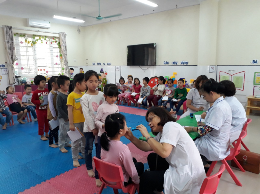 Trường MN Sơn Ca phối hợp với TTYT tổ chức khám sức khỏe cho học sinh toàn trường.