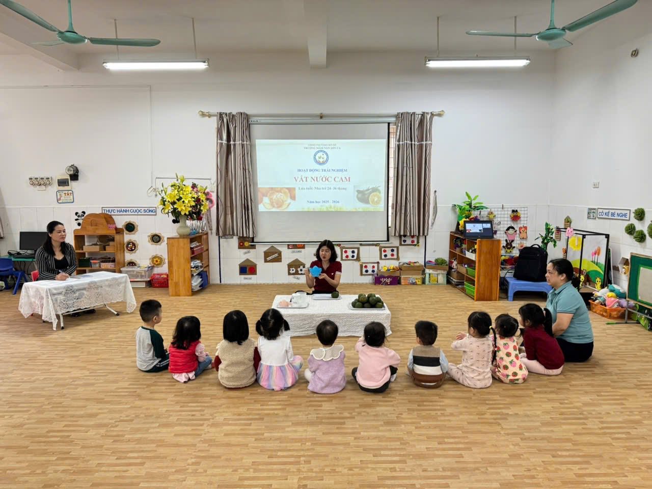 Hoạt động " vắt nước cam" ở lớp nhà trẻ D1 là hoạt động trải nghiệm giúp bé rèn luyện sự khéo léo, tự lập và tăng cường sức đề kháng. Bé được hướng dẫn cầm, xoay cam, tự tay pha nước cam và thưởng thức thành quả . Hoạt động cũng giúp bé tự tin và hứng thú hơn.