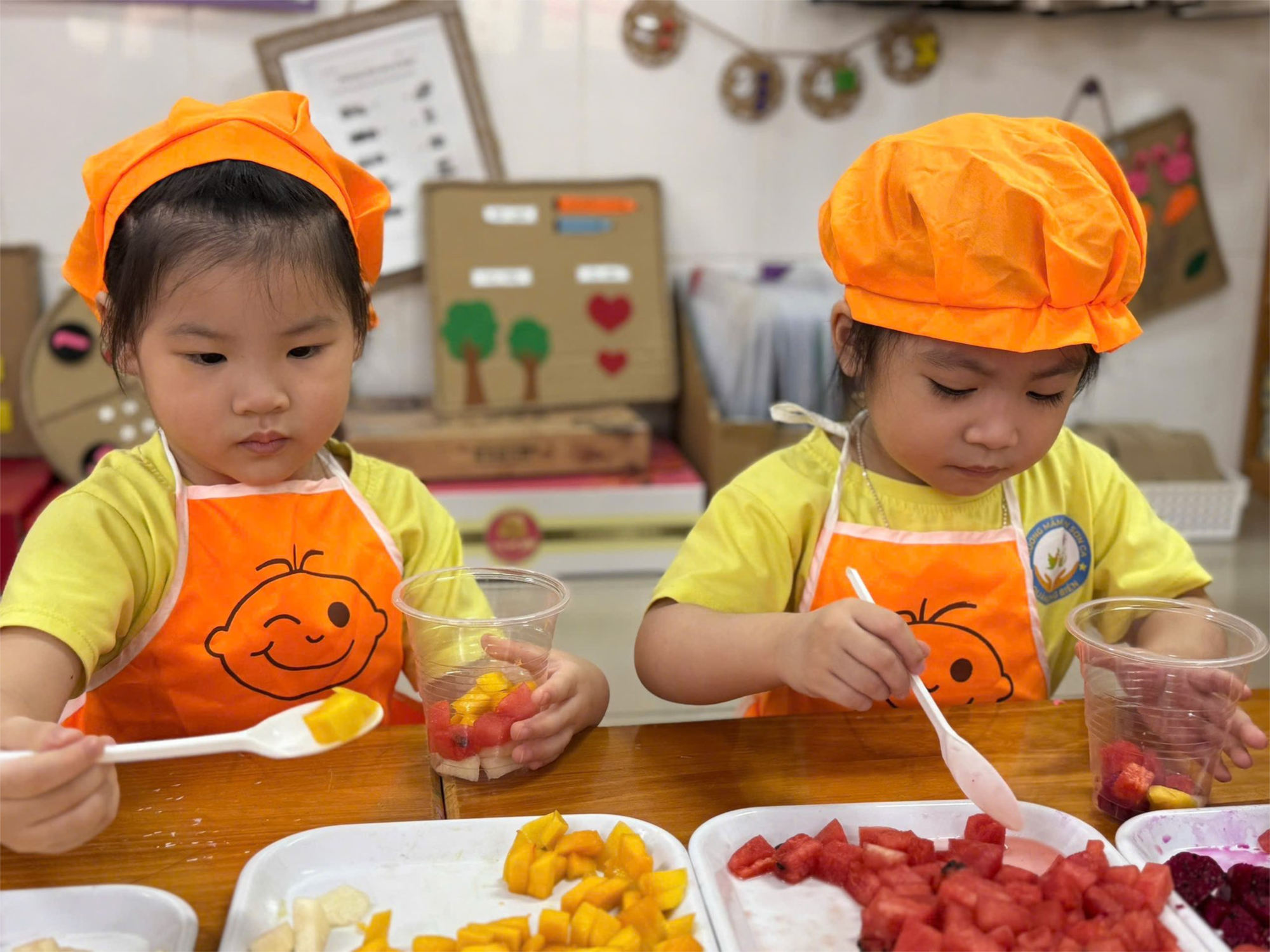 thanh long đỏ, xoài … Mỗi bạn nhỏ đều hào hứng tự tay lựa chọn những loại quả mình yêu thích và nhẹ nhàng cho vào cốc. Chỉ cần thêm một chút sữa chua mát lành rồi trộn đều, một cốc hoa quả dầm thơm ngon đầy màu sắc đã hoàn thành.