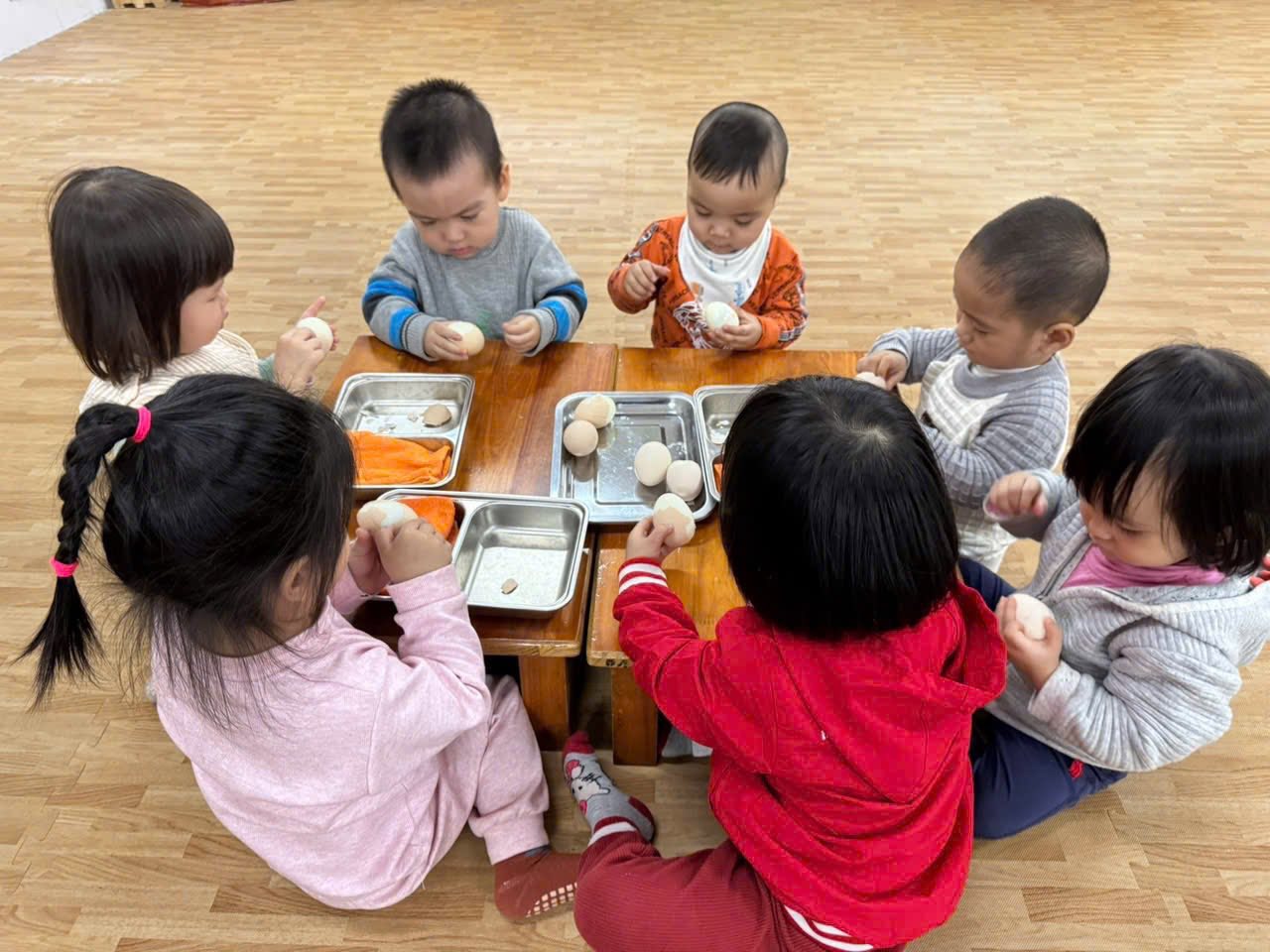 Hôm nay các bạn nhỏ lớp D1 đã được cô giáo hướng dẫn kỹ năng "Bóc vỏ trứng " đấy ba mẹ ạ.