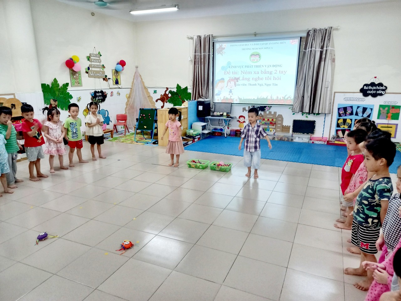 Hôm nay, các bé lớp mẫu giáo nhỡ B2 được cô giáo hướng dẫn tập vận động cơ bản: “Ném xa bằng 2 tay” - Trò chơi “Lắng nghe tôi hỏi”. Giờ hoạt động sôi nổi, thu hút các bé tham gia luyện tập rèn sức mạnh của đôi tay để ném bao cát đi xa, đồng thời tích cực tham gia trò chơi “Lắng nghe tôi hỏi” cùng cô giáo.