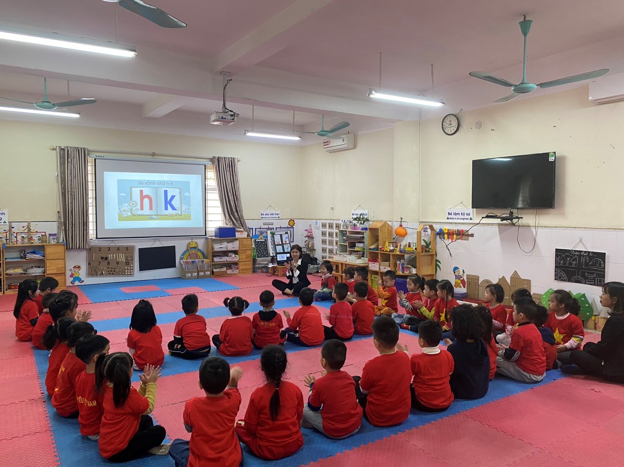 h, k”. Các bé hào hứng tham gia trò chơi “Vui cùng xúc xắc”; thảo luận nhóm khám phá đặc điểm cấu tạo của chữ cái h, k. So sánh điểm giống và khác nhau của chữ h, k; Trò chơi gạch chân các chữ cái trong từ. Thông qua hoạt động này, trẻ được nhận biết, phân biệt các chữ cái
