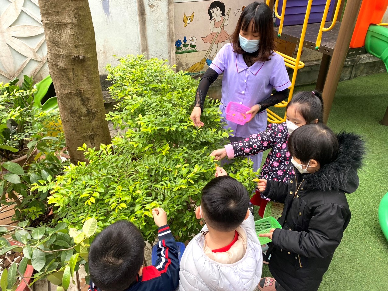 Hôm nay, cô và trò lớp mẫu giáo lớn A1 cùng tham gia lao động tập thể tại sân trường. Các bạn nhỏ rất hào hứng chăm sóc cây xanh, tưới cây, lau lá cho cây hoa, cây cảnh, nhặt lá vàng bỏ vào thùng rác... Hoạt động này không những giúp trẻ có được kỹ năng lao động mà còn hình thành ở trẻ tình yêu thiên nhiên, ý thức bảo vệ môi trường và biết quý trọng công sức lao động. Tham gia hoạt động còn giúp trẻ nhận biết về đặc điểm và sự phát triển của một số loại cây, cảm nhận được vẻ đẹp của mỗi loại cây, lợi ích của việc chăm sóc cây xanh. Như vậy trẻ sẽ thấy hứng thú khi tham gia lao động, thêm gần gũi, yêu thiên nhiên hơn.