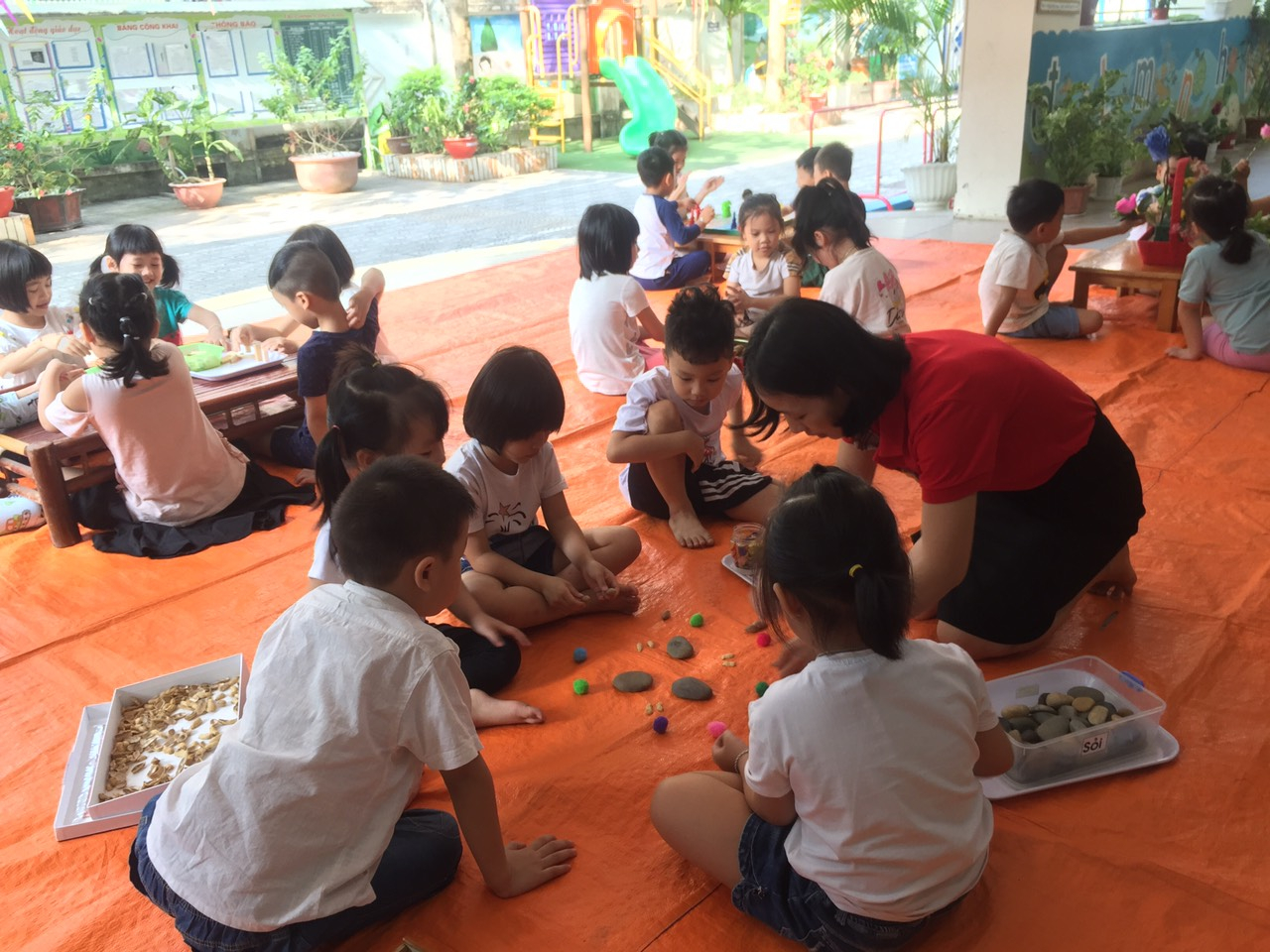 Trong những giờ hoạt động ngoài trời trẻ có còn được tham gia chơi tự do tại các nhóm. Có những nhóm trẻ tụm năm tụm ba chơi các trò chơi dân gian như cắp cua bỏ giỏ, chơi cá ngựa, hay tập cắm hoa, chơi rút gỗ, chơi xếp domino bằng các nguyên vật liệu rời… hay chơi với cầu trượt, xích đu.