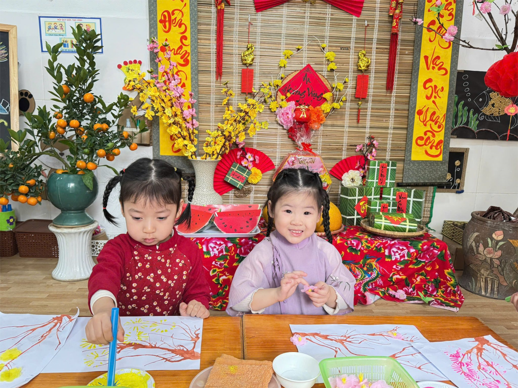 Hôm nay, các bạn nhỏ đã cùng nhau hóa thân thành những “nghệ nhân nhí”, tỉ mỉ dán từng cành đào, cành mai