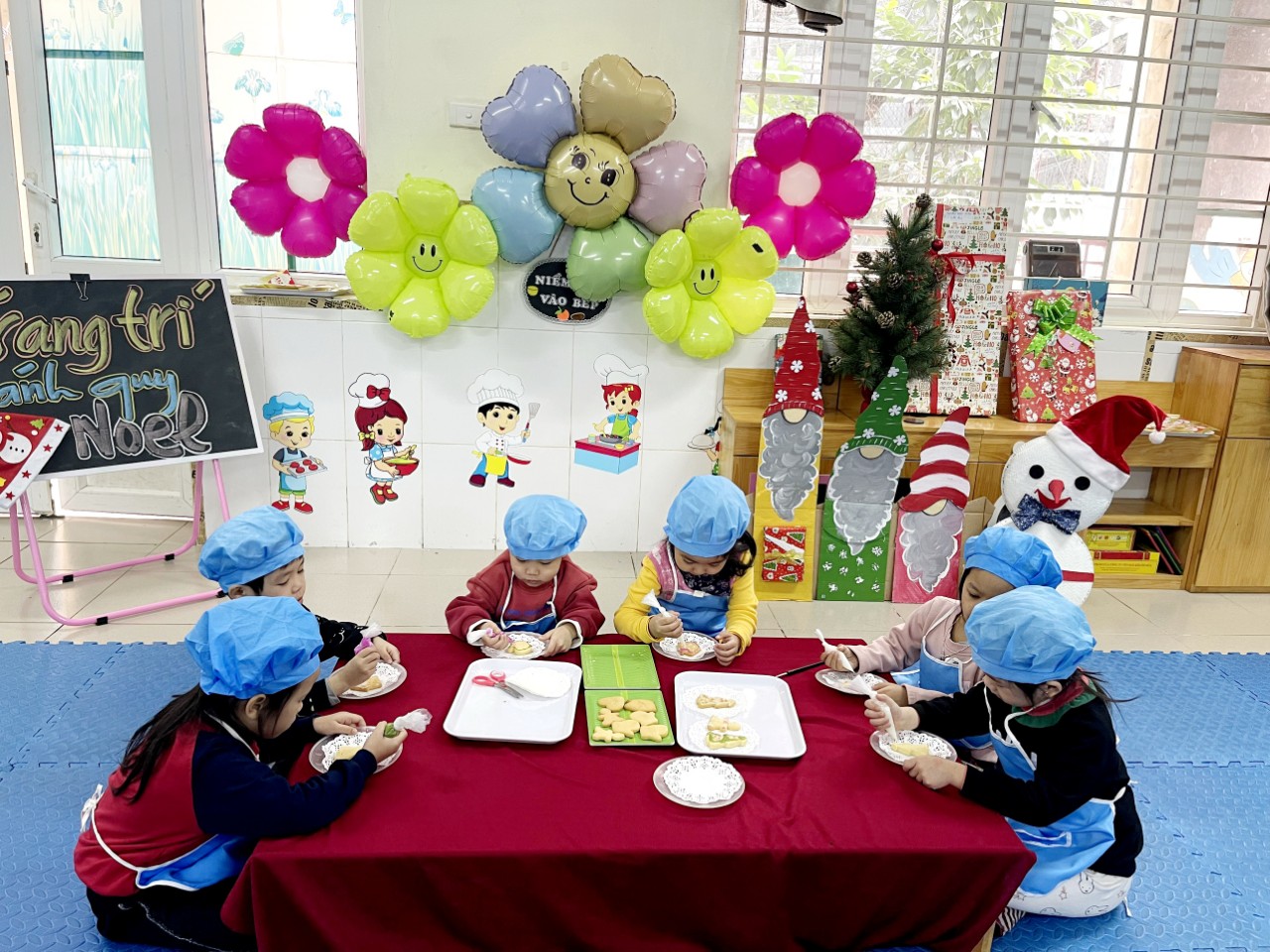 Noel ở lớp chúng mình thật ngọt ngào với những chiếc bánh quy thơm nức, được chúng tớ trang trí từ kem và đường. Những chiếc bánh quy không chỉ có vị ngọt, thơm mà còn là món quà vô giá chứa đựng yêu thương. Đây cũng sẽ là trải nghiệm giúp trẻ phát triển kỹ năng vận động tinh của tay, tăng khả năng sáng tạo qua những hình thù và màu sắc, sẻ chia với bạn bè thành quả mình có được và học cách nói lời yêu thương.