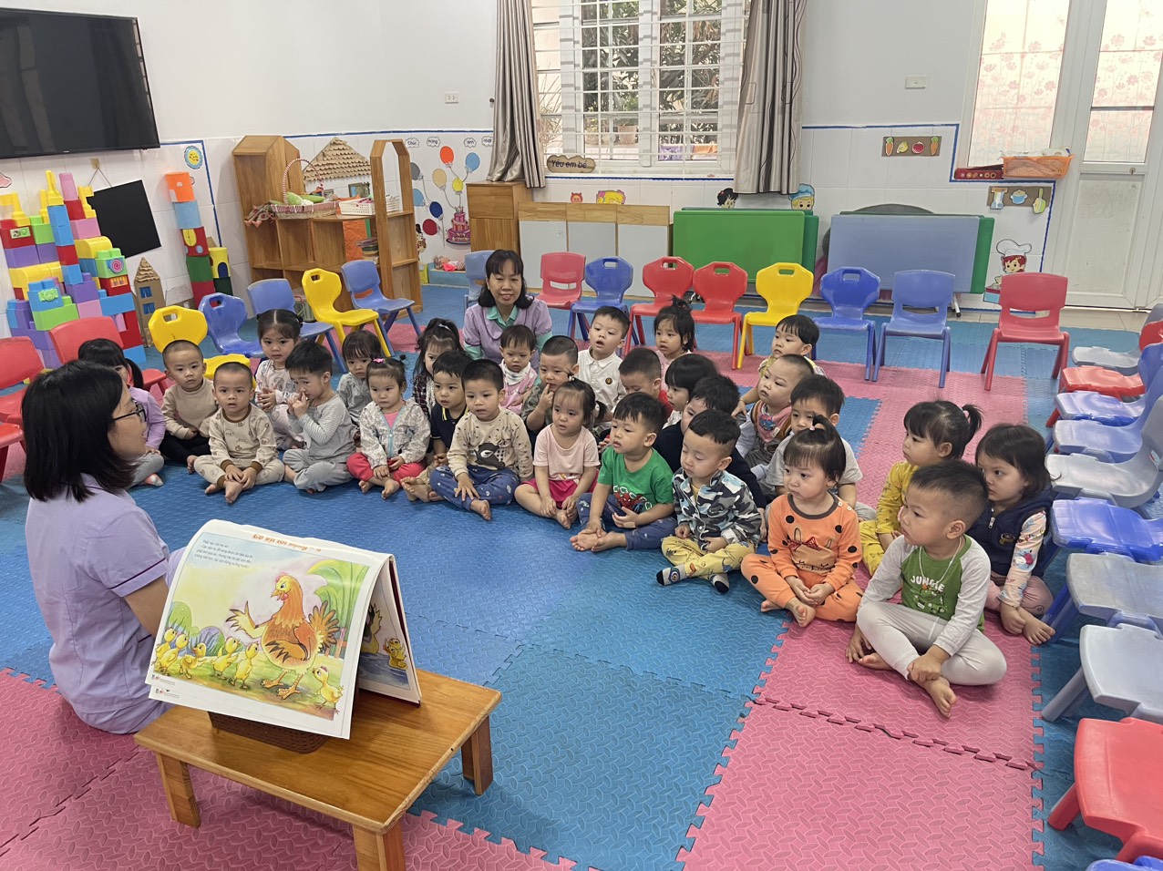 Hôm nay các cô giáo lớp nhà trẻ D2 đã cho trẻ làm quen với câu chuyện: " Vì sao thỏ cụt đuôi". Câu chuyện kể về bạn Thỏ vì mải chơi không tuân thủ luật lệ khi tham gia giao thông nên đã bị ô tô đè lên đuôi và bị đứt mất một đoạn đuôi. Thông qua câu chuyện trẻ biết khi tham gia giao thông phải đi cùng người lớn và chấp hành đúng luật lệ giao thông. Qua đó trẻ yêu thích câu chuyện hơn và học hỏi được nhiều điều từ câu chuyện.