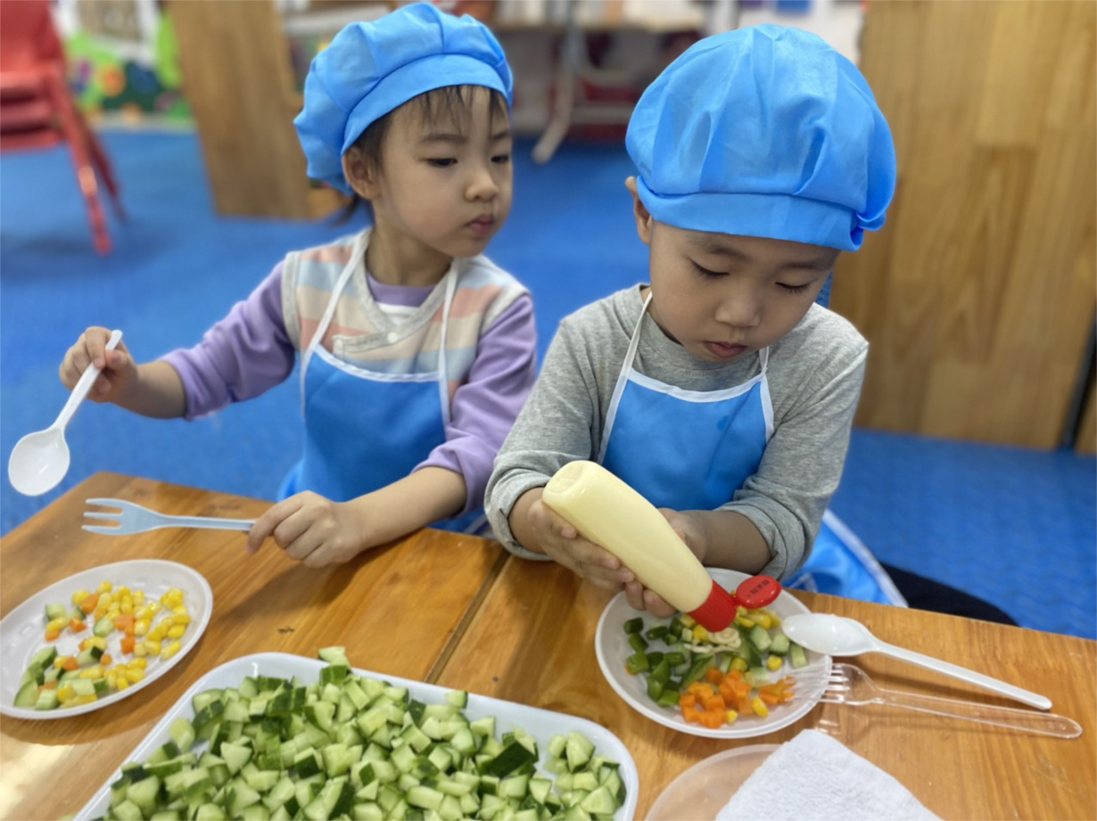 Hoạt động tiếp theo các bé còn được cô giáo hướng dẫn thực hành quy trình làm món: "SALAT NGÔ"