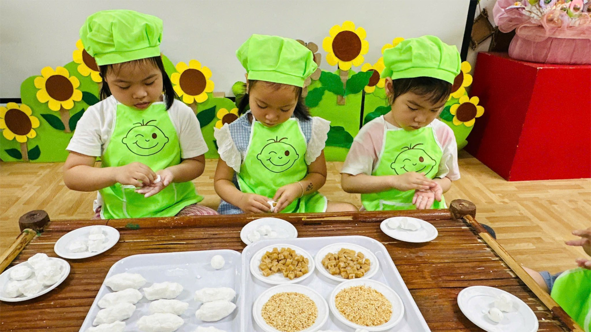 ✅ Dưới sự hướng dẫn khéo léo của cô giáo, các con được tìm hiểu về nguồn gốc, ý nghĩa của ngày Tết Hàn Thực và món bánh trôi truyền thống của dân tộc. Đôi bàn tay bé nhỏ thoăn thoắt nhào bột, vê tròn, nặn bánh, rồi tỉ mỉ đặt nhân đường đỏ au vào giữa, bọc lại thành những viên bánh xinh xắn. Tiếng cười nói rộn rã vang lên, xen lẫn sự chăm chú, tập trung thể hiện rõ trên từng gương mặt.