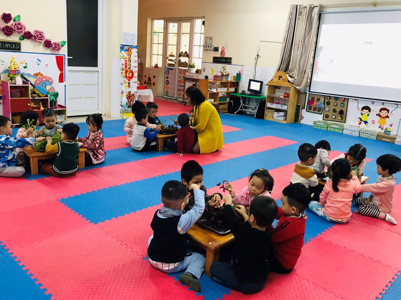 Hôm nay các bạn nhỏ lớp C2 tham gia tiết học khám phá về một số loại rau ăn lá. Các cô đã chuẩn bị rất kỹ lưỡng các loại rau có lá, củ, quả thường xuyên xuất hiện trong gian bếp nhà bé như: bắp cải, rau cải cúc, rau dền, su hào, cà rốt, khoai tây, súp lơ, cà chua, quả đỗ…. Đó là những loại rau, củ, quả an toàn, tươi ngon, được rửa sạch và để ráo phục vụ cho việc học tập của các bé.
