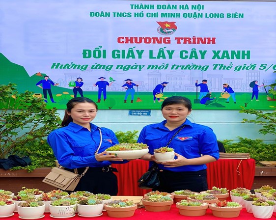 Đồng chí Kim Hoa – Thùy Trang trực tiếp tham gia hoạt động đổi giấy lấy cây xanh và thu gom Pin phế liệu tại sân trường THCS Thượng Thanh