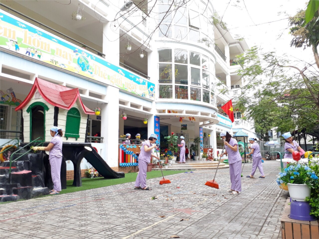 Ban chỉ đạo cũng tiến hành phân công nhiệm vụ cho giáo viên nhân viên trong trường thường xuyên dọn dẹp thông thoáng lớp học, vệ sinh đồ dùng, đồ chơi của trẻ, khu vui chơi của trẻ, khu vệ sinh, góc thiên nhiên. Với nhà bếp, khu chế biến và vệ sinh sau cùng luôn được sắp xếp gọn gàng. Tất cả đồ dùng dụng cụ được rửa sạch và để khô ráo, rác thải được thu gom trong ngày không ứ đọng tại bất kỳ nơi nào trong nhà trường.