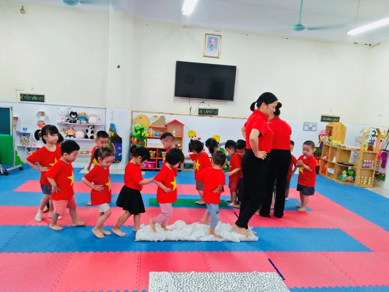 Các bé đang cùng nhau tranh tài qua trò chơi: “Đôi chân khéo léo”