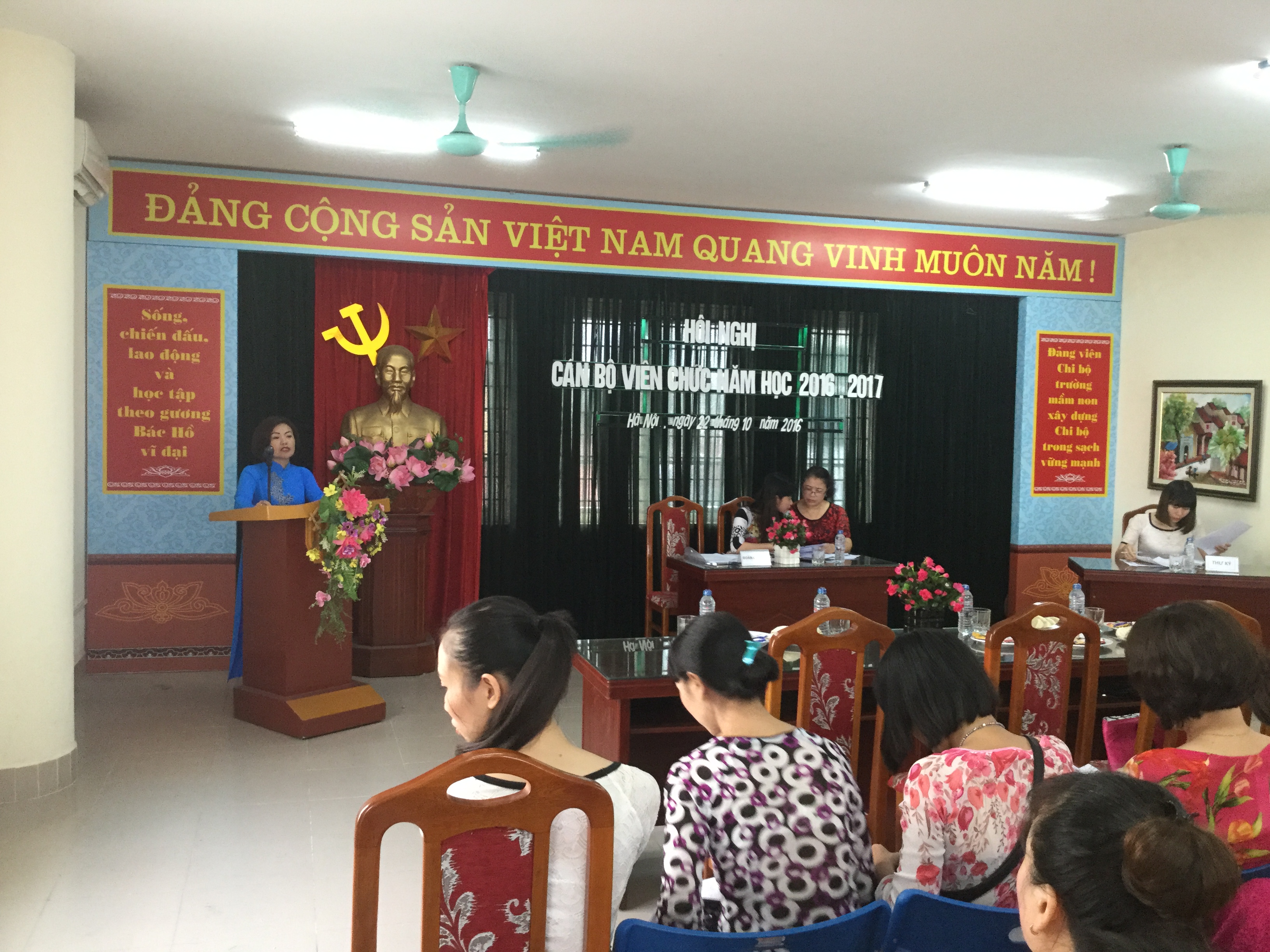 Thực hiện nhiệm vụ năm học 2016- 2017 , để thống nhất kế hoạch chỉ tiêu thi đua năm học, ngày 22 tháng 10 năm 2016 trường mầm non Sơn ca tổ chức Hội nghị cán bộ viên chức năm học 2016- 2017. Dự hội nghị có đồng chí Trần Thị Thanh Thủy – Bí thư chi bộ - Hiệu trưởng nhà trường; đồng chí Lưu Thị Vân- Phó hiệu trưởng - Chủ tịch công đoàn và toàn thể cán bộ, giáo viên, nhân viên trường mầm non Sơn Ca.